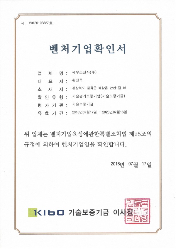 벤처기업확인서-제우스전자(주)